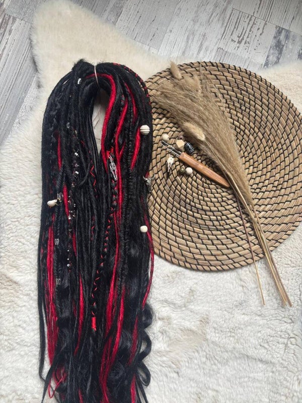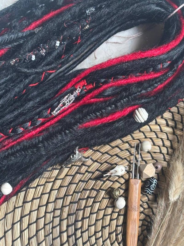 Deze mooie zwart rode dread set bestaat uit 41 DE dreads van ongeveer 60 cm. Omdat ik onlangs ben overgestapt naar een ander soort haar en dit nog een restant ervan is mag deze weg voor een klein prijsje! Dat is ook de reden dat het niet meer een complete set is. Heb jezelf bijvoorbeeld zwarte dreads kunnen deze prima toegevoegd word. Of begin je net met dreads is 40DE meestal een mooie hoeveelheid om mee te beginnen. Zeker ook vanwege de prijs!