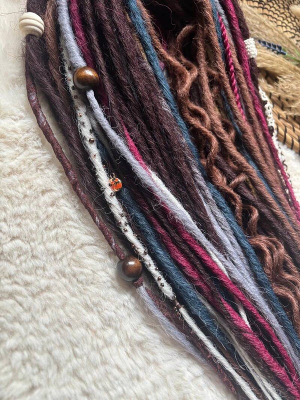 Deze mooie set is waanzinnig mooi voor deze periode van het jaar. Langzaam gaan we de herfst in en deze kleuren combi zegt hallo herfst met een knipoog naar de zomer. De set bestaat uit 60DE dreads en vlechtjes waarvan er 12 gedecoreerd zijn. Het totaal gewicht is 261 gr!!! De lengte is ongeveer 60cm.